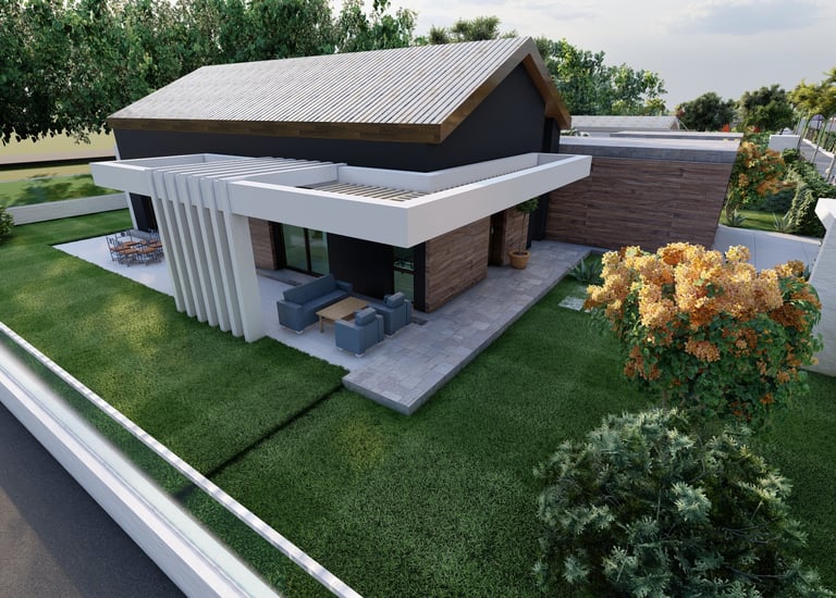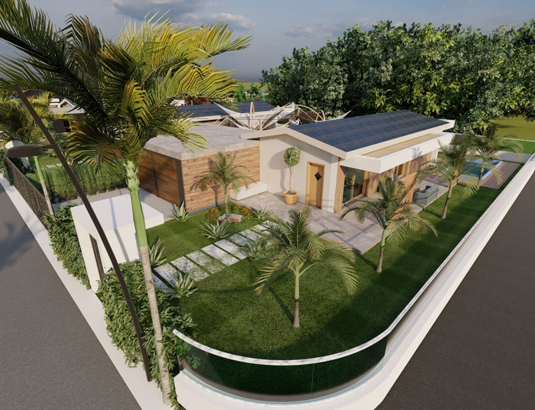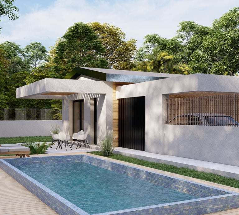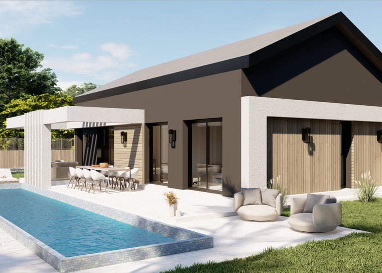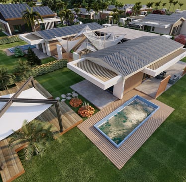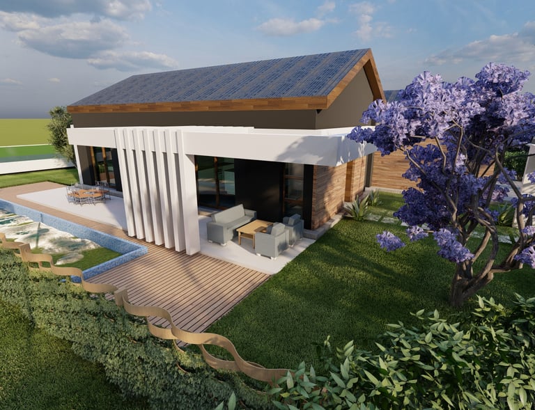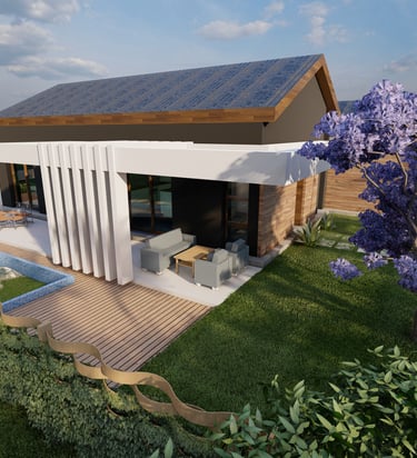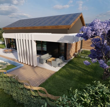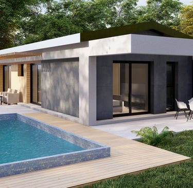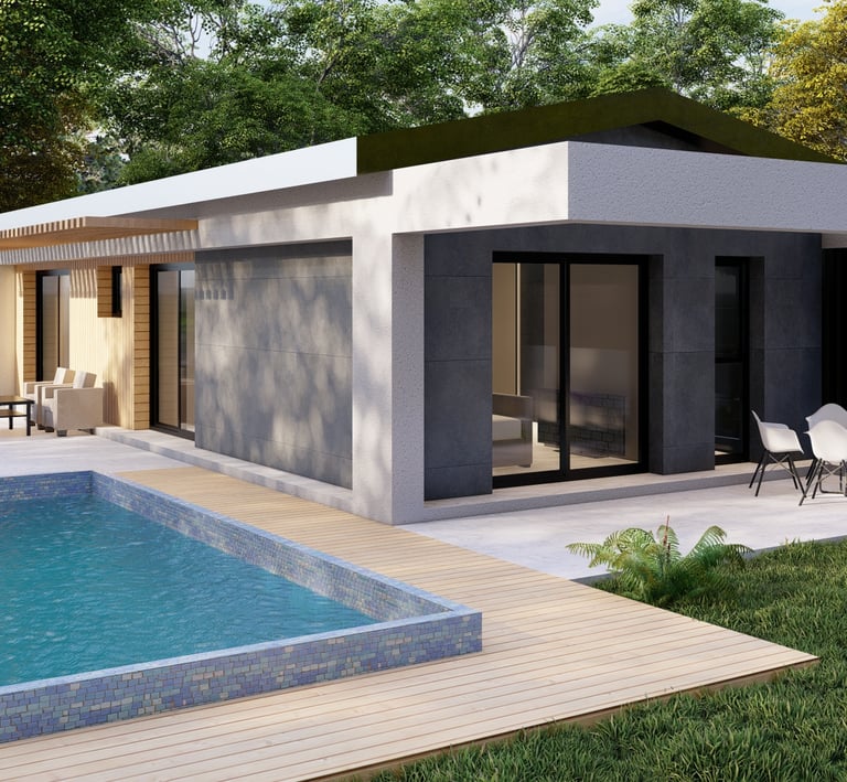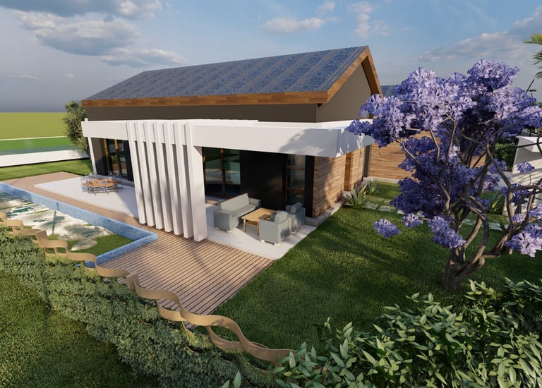 Tre ville moderne con piscina, dettagli eleganti e sostenibili.