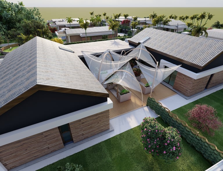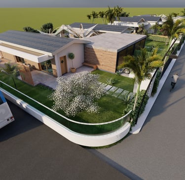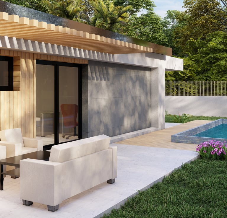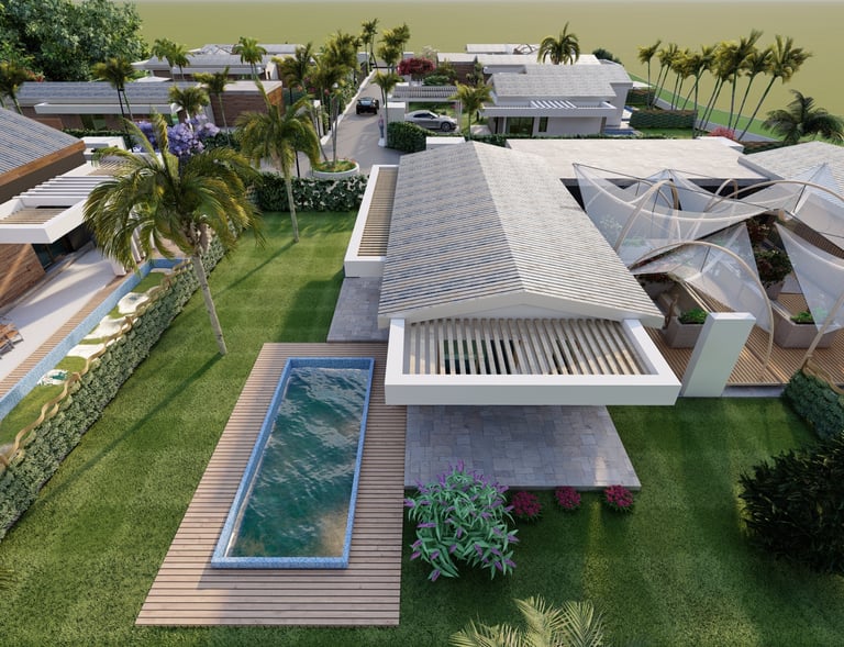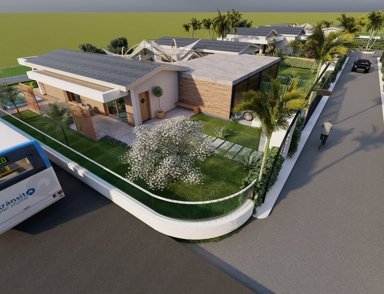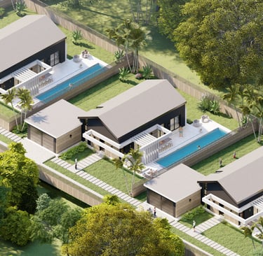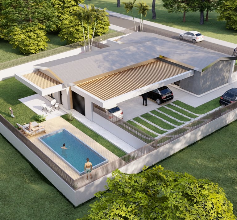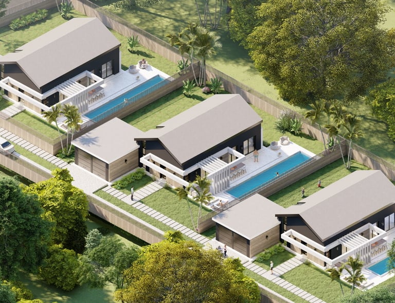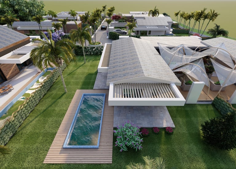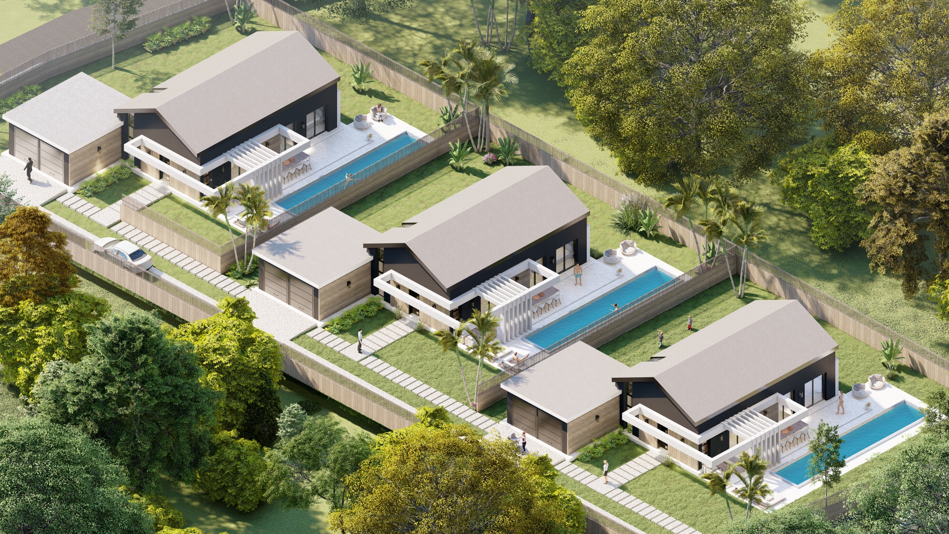 Tre ville moderne con piscina, dettagli eleganti e sostenibili.