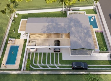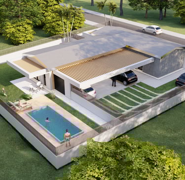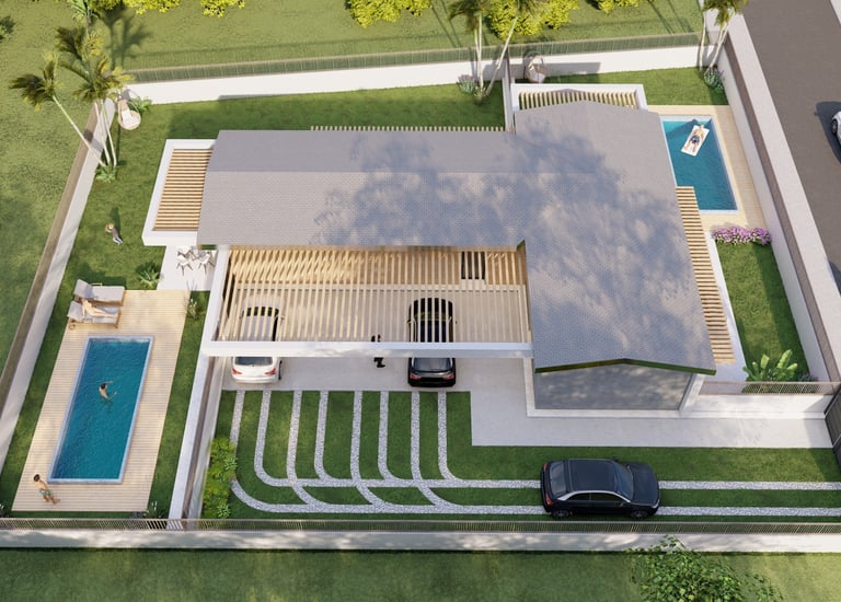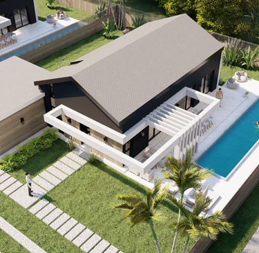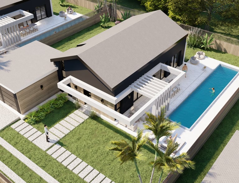 Bifamiliare di design con ampi spazi esterni e due piscine private, ideale per vivere comfort e privacy immersi nel verde.